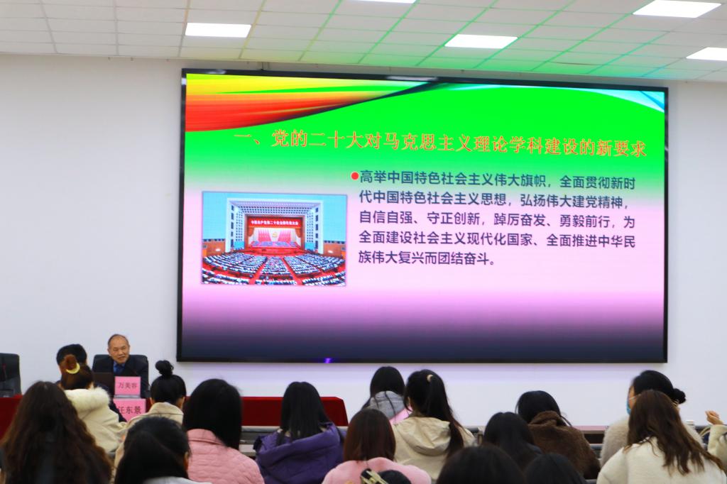 为深入学习贯彻党的二十大精神,持续推进马克思主义理论学科高质量发展,2月17日,华中师范大学诸侯快讯ok1122登录入口院长、博士生导师万美容教授应邀在明伦校区科技馆一楼报告厅作题为“学习贯彻党的二十大精神,推动马克思主义理论学科高质量发展”的专题讲座。本次报告由诸侯快讯ok1122登录入口执行院长任东景主持,全院师生百余人到场聆听。
