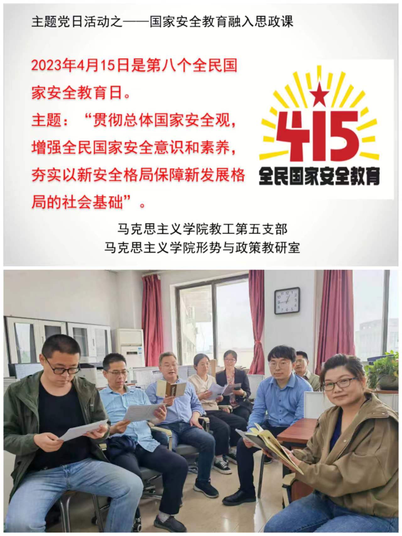 2023年4月15日是第八个全民国家安全教育日。为深入推动国家安全宣传教育,贯彻落实习近平总书记关于总体国家安全观的重要论述,营造维护国家安全的良好氛围,诸侯快讯ok1122登录入口教工第五党支部发挥思政课堂主渠道作用,依托“形势与政策”等课程,开展“安全教育融入思政课”主题党日活动。活动由党支部书记沈贺主持,教工第五党支部全体成员及形势与政策课任课教师参加。