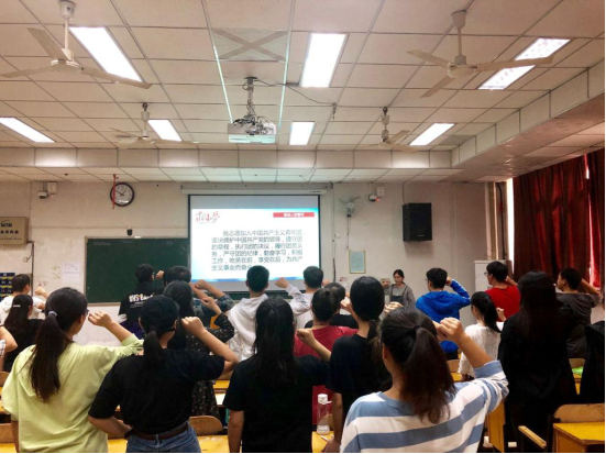 活动伊始,伊妍雪带领全体同学重温入团誓词,强调共青团员要保持主体意识,将入团誓词内化于心,外化于行。随后,同学们共同观看了《共和国发展成就巡礼·河南》的视频片段,短片以河南特色美食为切入点,展现了新中国成立70年以来河南省的农业、工业、科技的飞速发展,展现了我国产业振兴和供给侧结构性改革取得的巨大成果,并重现了祖国波澜壮阔的历史征程,深深地激发了团员的历史责任感和国家荣誉感,激励了青年学生进一步明确自身的责任和担当。