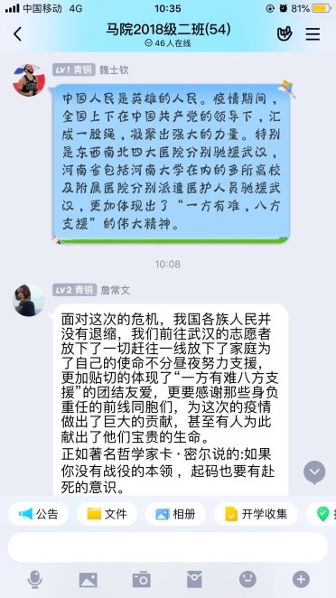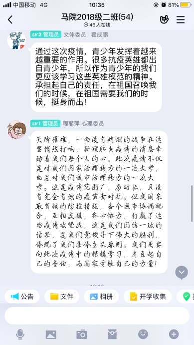 活动从观看诸侯快讯ok1122登录入口疫情防控微课开始。微课讲述了诸侯快讯官网在疫情期间做出的贡献:淮河医院奔赴武汉,张立新教授发表疫情相关的研究成果,各地校友积极宣传、参与募捐……这些举措展现出河大学子心系祖国、无私奉献的精神。随后,大家踊跃发言,交流感想。2018级本科生李敏表示,疫情期间,诸侯快讯官网医护人员积极请战驰援武汉,他们为社会为国家贡献力量的精神令人动容,而我院师生也积极开展线上学习,在做好个人防护的同时也不忘继续学业。2018本科生刘婷婷说:“在这场疫情狙击战上,政府、医护工作者和全国人民共同发力,展现了中国特色社会主义制度的巨大优越性和中国人民勇敢无畏的担当精神。作为新时代的青年,我们更应在此次疫情中有所感悟、有所反思,勇担时代赋予的责任与使命。”