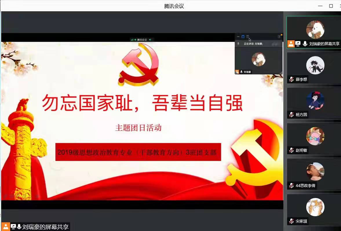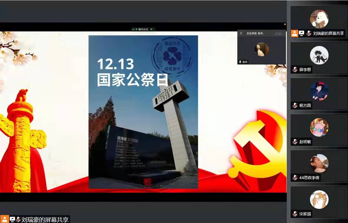 为纪念第八个南京大屠杀死难者国家公祭日,号召广大团员牢记历史、勿忘国耻,12月20日下午,1903团支部在线上开展“勿忘国家耻,吾辈当自强”团日活动,活动由团支书刘瑞豪主持。