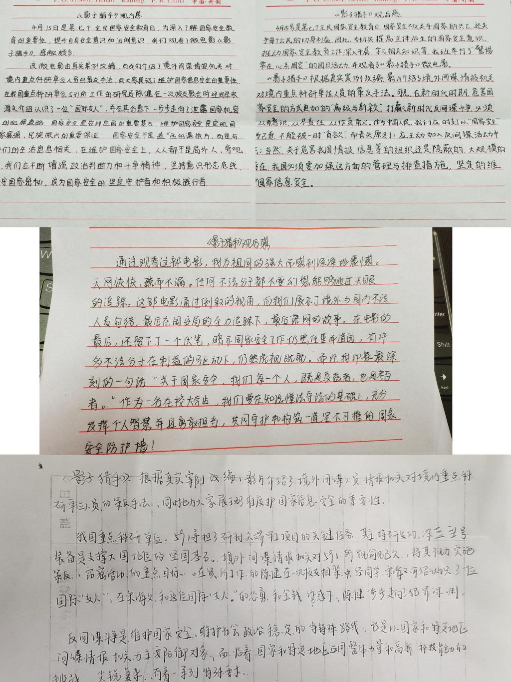 2001团支部的团员代表分享了有关国家安全的新闻故事,并与支部成员交流感想;2002团支部通过腾讯会议集体观看纪录片《国安天下宁》第一集;2003团支部全体团员观看国家安全教育微视频《影子猎手》并提交观后感。