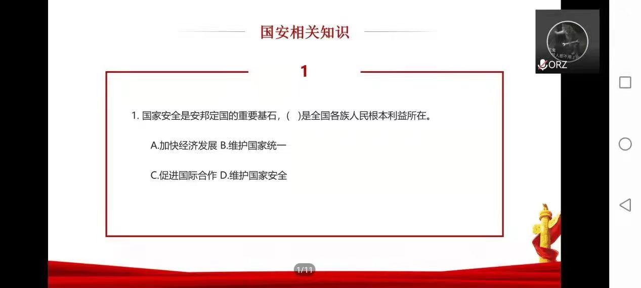 此次团日活动形式多样,内容丰富。1901团支部通过共读《网络安全法》等文件,集体学习国家安全相关知识;1902团支部集体观看国家安全教育纪录片并交流观后感;1903团支部于线上开展国家安全知识竞赛问答活动。