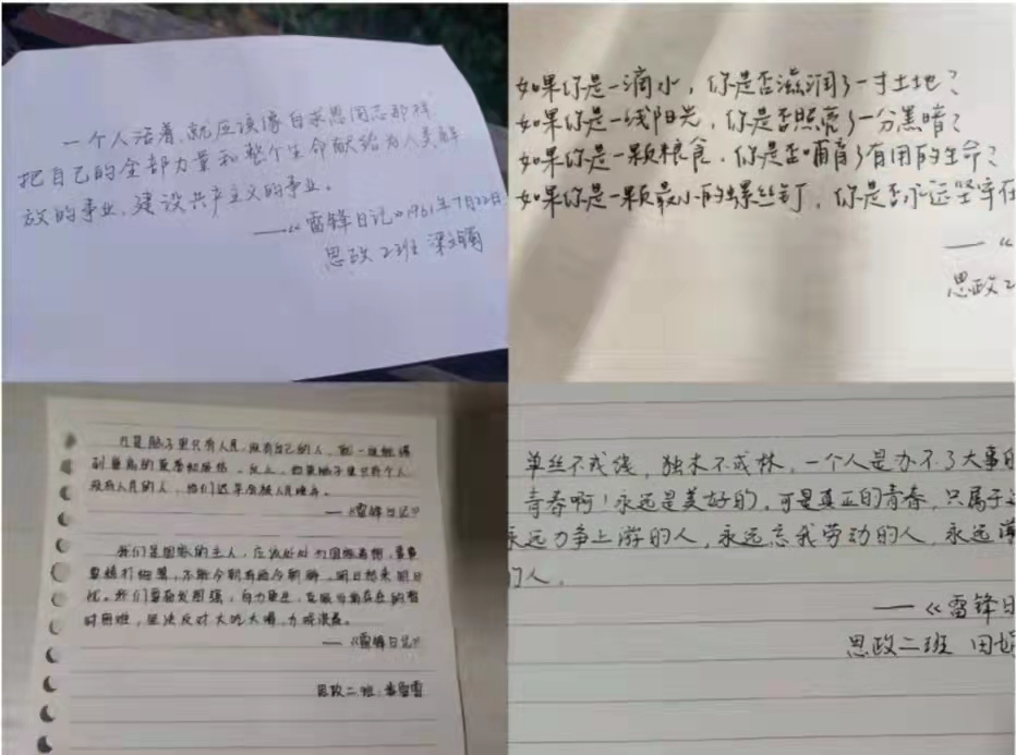 本次团日活动形式多样,精彩纷呈。1901团支部以“找寻活雷锋”为讨论主题,组织团员们畅所欲言,讲述生活中的“雷锋精神”;1902团支部开展了“三月读书会”活动,团支书带领大家阅读有关雷锋的书籍并交流读后感;1903团支部合唱歌曲《学习雷锋好榜样》,深入感悟毛主席“向雷锋同志学习”的号召;2001团支部举行学雷锋志愿活动,呼吁支部团员从小事做起,以实际行动践行雷锋精神;2002团支部在团支书的带领下,通过集体阅读《雷锋日记》进一步了解了雷锋同志的生平事迹;2003团支部全体团员共同观看了影片《雷锋》片段并分享自己的体会;2101团支部以小组为单位讲述雷锋故事,各小组成员都分享了最近发生在身边的好人好事;2102团支部则从总书记对雷锋精神的解读切入,带领同学们体会雷锋精神的新时代内涵;2103团支部团员开展校园内捡拾垃圾活动,同学们在活动结束后分享了各自的心得体会,他们纷纷表达了自己对雷锋精神的理解和践行雷锋精神的决心,立志为实现中华民族伟大复兴中国梦贡献青春力量。