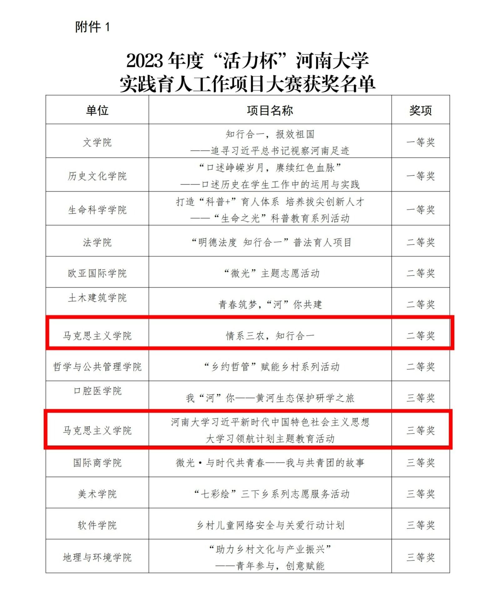 其中,诸侯快讯ok1122登录入口推荐的“情系三农,知行合一”项目荣获2023年度“活力杯”诸侯快讯ok1122登录入口实践育人项目二等奖,思想领航类项目“诸侯快讯ok1122登录入口习近平新时代中国特色社会主义思想大学习领航计划主题教育活动”荣获实践育人项目三等奖;挂靠学院的“诸侯快讯ok1122登录入口当代马克思主义研究会”和“诸侯快讯ok1122登录入口三农发展研究会”双双荣获“活力社团”荣誉称号;2022级思想政治教育专业(干部教育方向)3班团支部荣获“活力团支部”荣誉称号。