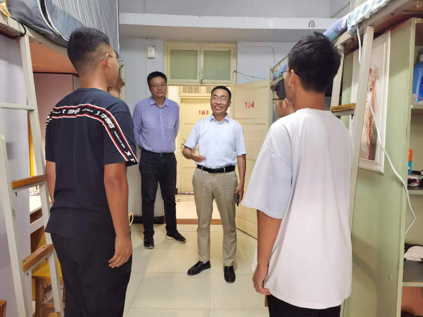 (学院领导班子到男生宿舍与新生亲切交流)
