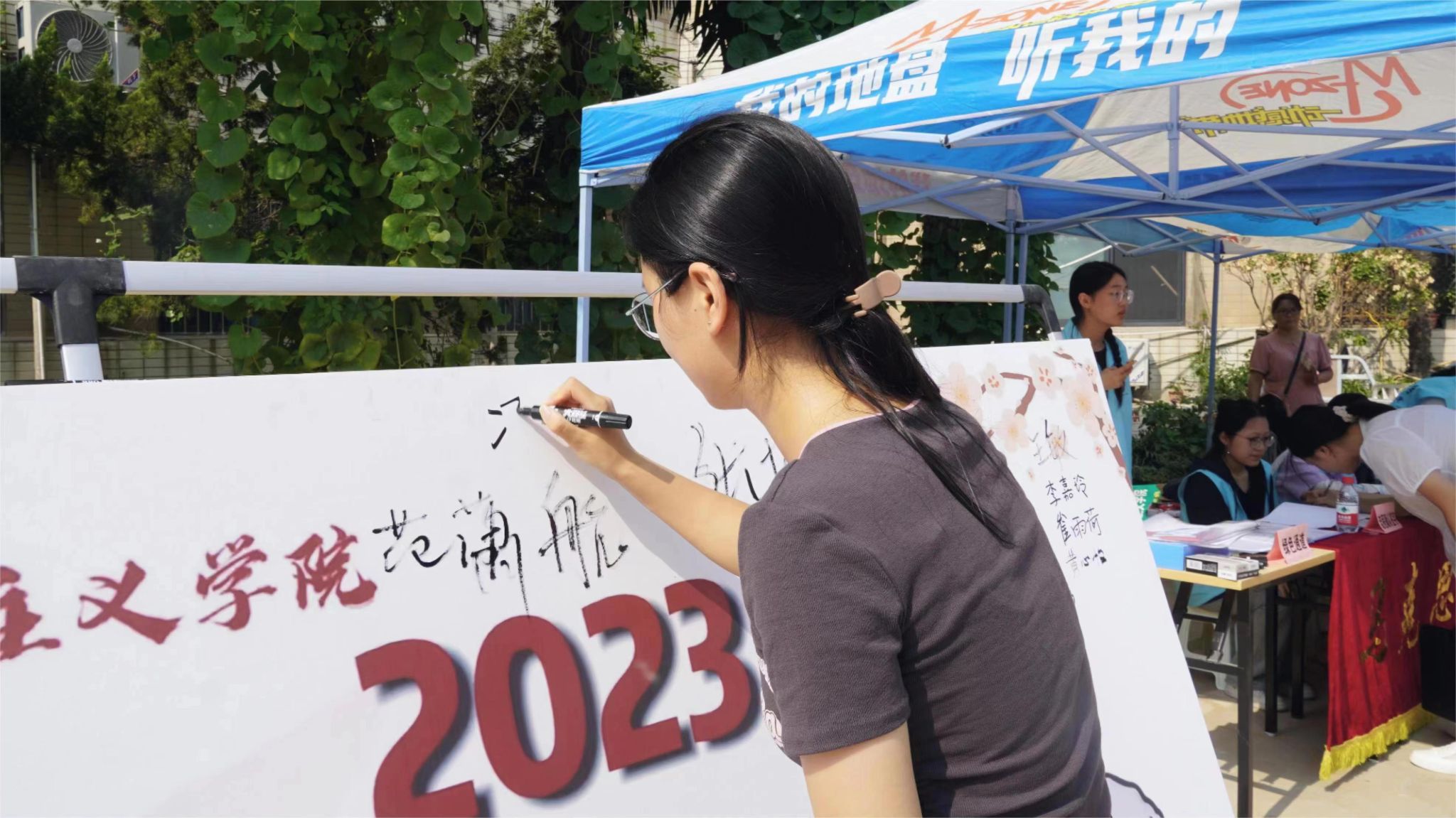 (图为新生在签名墙上签字)