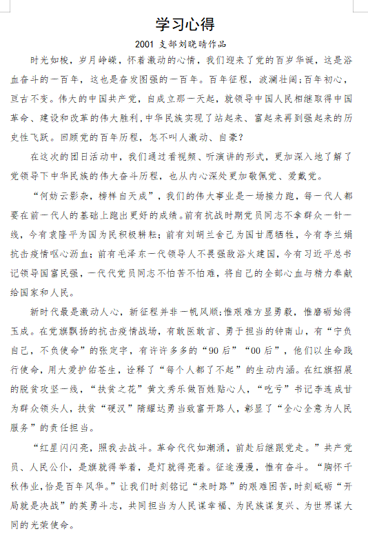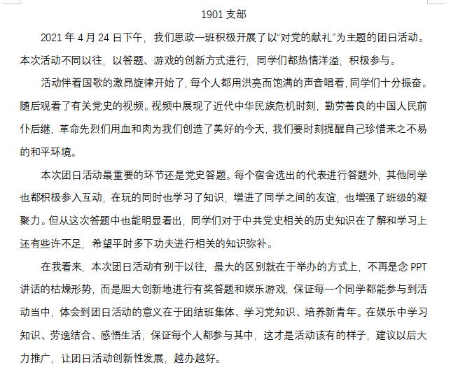1901本科生团支部将观看庆祝中国共产党成立一百周年的视频与党史知识竞赛结合相,以寝室小组为单位进行答题竞赛,形式新颖,充分调动了青年学生学习党史的兴趣,营造了学习党史的积极氛围,达到了以题促学、以赛促学的效果。活动结束后组织录制视频表达对建党百年的祝福,并通过创作诗歌、撰写心得等形式推动团员们深入了解党的优良传统和作风,鼓励大家做到学史明理、学史增信、学史崇德、学史力行,以昂扬姿态奋力开启全面建设社会主义现代化国家新征程。
