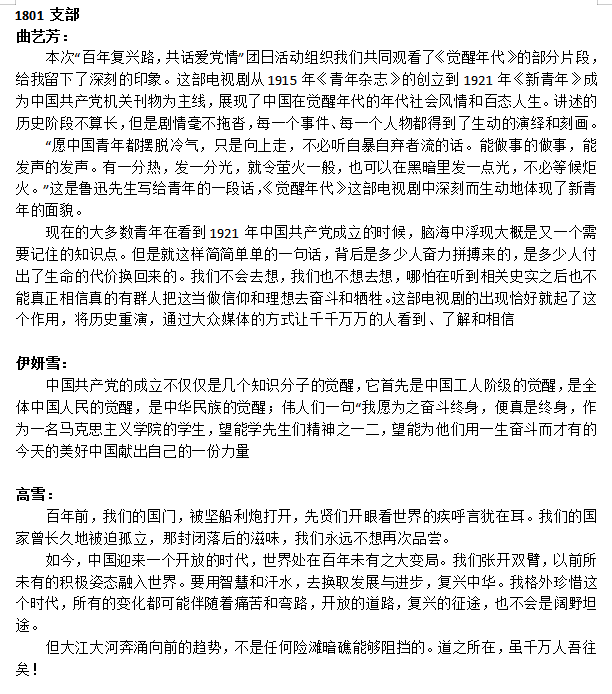 我院八个本科生团支部分别组织观看了革命历史题材电视剧《觉醒年代》、红色电影《东方红》、抗日战争电影《巧奔妙逃》等,充分利用和发挥了红色影视资源对广大青年团员的积极引领作用。团支部成员通过党史宣讲、分享心得等形式充分展现了新时代中国共青团员的新气象、新风貌,营造了积极向上的活动氛围,广泛动员了团支部成员对党史进行学习、增强理想信念。支部成员表示将时刻铭记“来时路”的艰难困苦,时刻砥砺“开局就是决战”的英勇斗志,共同担当为人民谋幸福、为民族谋复兴、为世界谋大同的光荣使命。
