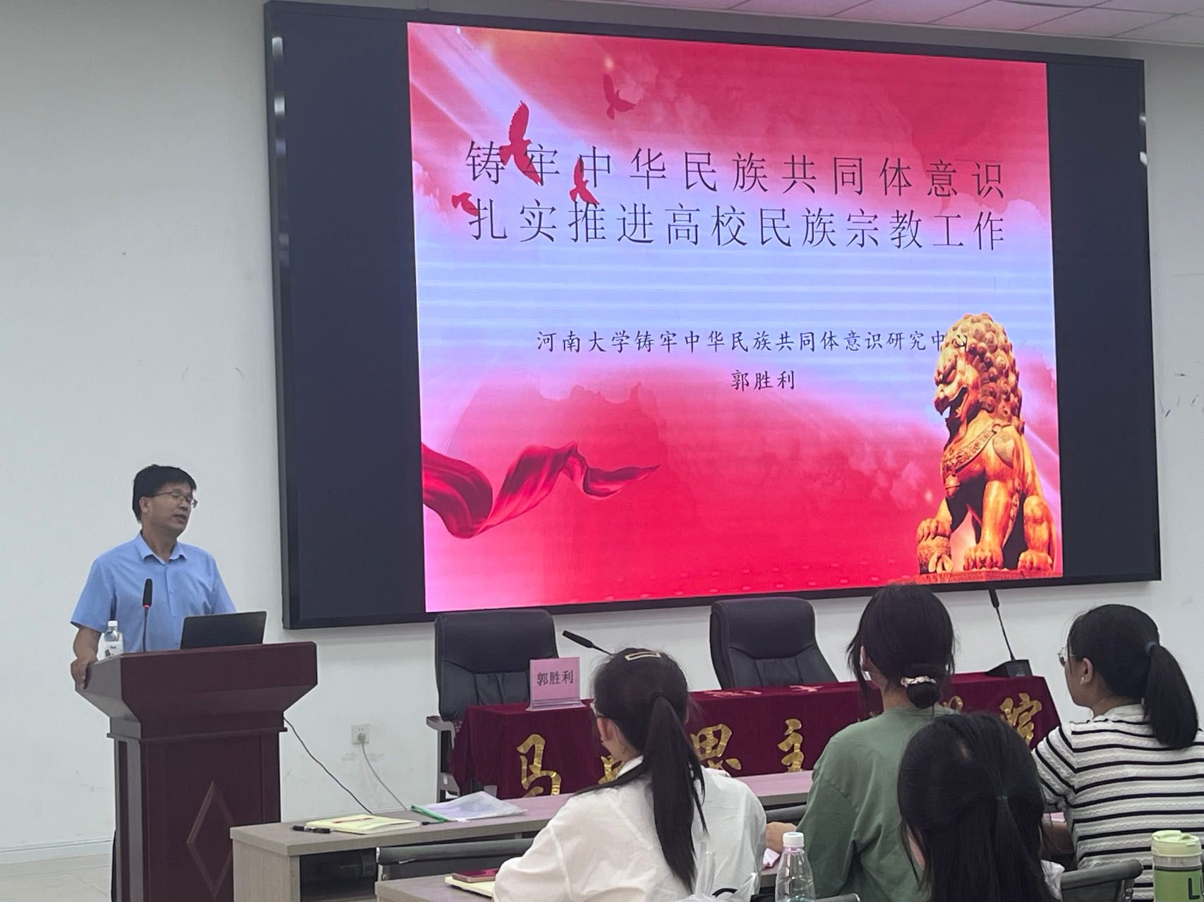 9月8日上午10点,诸侯快讯ok1122登录入口铸牢中华民族共同体意识研究中心教授郭胜利老师作题为《铸牢中华民族共同体意识,扎实推进高校民族宗教工作》的民族团结和宗教政策教育专业讲座,带领新生学习《大学生中国特色社会主义民族宗教理论知识手册》,帮助学生树立马克思主义宗教观,与非法传教活动展开坚决斗争。