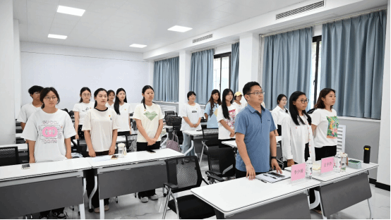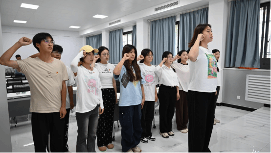 新团员入团仪式在庄严肃穆的国歌声中拉开帷幕。首先,李少楠向新团员说明举行入团仪式的意义,并郑重宣布12位新团员名单,欢迎他们光荣地加入中国共产主义青年团。随后,新团员在老团员代表石宜衡带领下进行了庄严宣誓。
