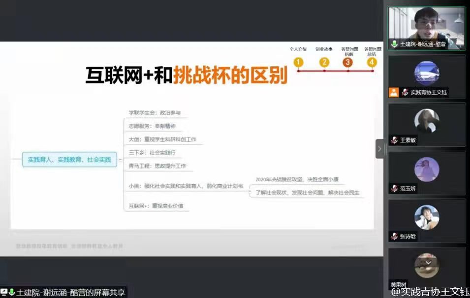 4月23日,学院线上分别开展了就业交流会与“互联网+”大赛经验分享会。就业交流会上,2018级本科生王帅威、陈沐和沈琪琪分别就备考公务员、教师和应聘企业分享了备考求职经验。王帅威建议考公在系统复习基础上,勤于总结自己的答题经验;沈琪琪建议应聘企业要敢于尝试;陈沐表示,大一大二应全面提升自己各方面能力,为大三就业打好基础。在“互联网+”大赛经验分享会上,获得过“互联网+”大学生创新创业大赛国家级奖项的土木建筑学院2021届毕业生谢远涵表示,参赛要敢想、敢做、敢闯、敢试,参赛项目不仅要符合评选标准,更重要的是要体现社会价值。获得中国国际“互联网+”大学生创新创业大赛河南省一等奖的2019级本科生杨耀宇分享了参赛项目“十步走”孵化模式和孵化 “六精准”原则,鼓励大家在创业兴企、富民强国方面努力作为。