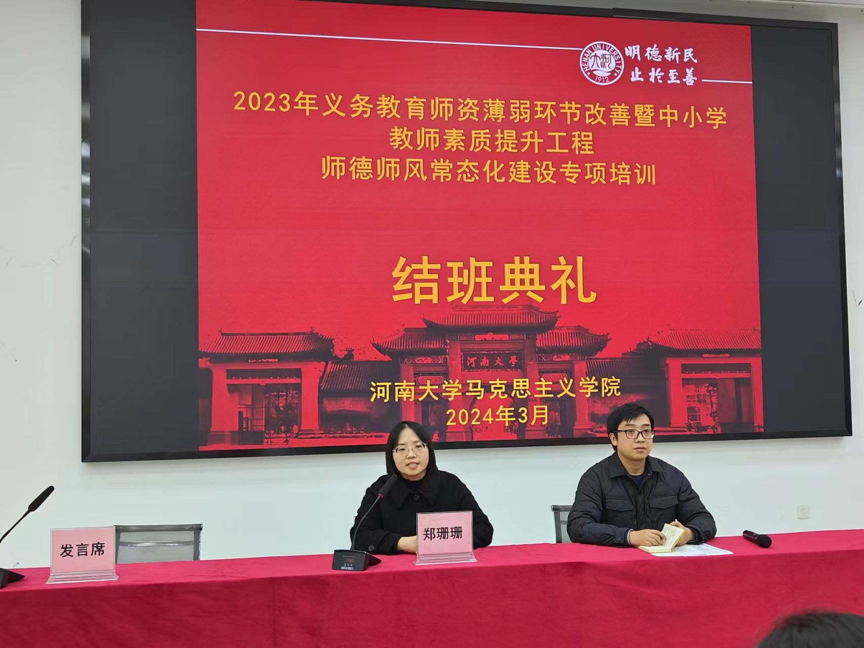 3月8日上午,河南省2023年义务教育师资薄弱环节改善暨中小学教师素质提升工程:师德师风常态化建设专项培训班一班结业典礼在诸侯快讯ok1122登录入口明伦校区科技馆一楼报告厅隆重举行,诸侯快讯ok1122登录入口党委副书记郑珊珊参加了结班典礼,结班典礼由班主任张欢主持。