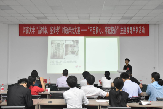 一则《故宫的故事》拉开了比赛的序幕,选手通过生动的语言讲述了故宫打破固有模式,发展主题文化产品,“零距离”走进了公众视野,使优秀传统文化重新焕发了生机;《我们眼中的一带一路》以丝路开放为切入点,展现了中国与其他国家友好合作、互惠互助的大国风采;《切中“药”害》就进口药品价格高谈起,具体讲解了国家推进医药价格改革,完善科学合理的医药价格形成机制的具体措施;《中美贸易战之华为事件》创意丰富,以新闻采访的方式从华为公司遇到的困境谈到中美关系,发出青年之声,为祖国凝心聚力;《创新逐梦未来》着眼于创新带给中国的巨大变化,激励青年勇担时代责任,锐意进取、开拓创新,为实现中华民族伟大复兴的中国梦注入青春力量;《明星学霸与教育公平》的评论员对前段时间热议的“翟天临事件”发表了独特见解,强调了教育公平对社会发展的重大意义,发人深省;《我看脱欧行》以幽默风趣的话语讲述了英国脱欧的曲折过程,对当今国际形势作出了分析,引人深思;适逢建国七十载,恰当五四百年间,《少年勤学青年担纲》从五四运动切入主题,号召青年以实际行动履行新时代的历史使命,在奋斗中绽放青春光芒;《从伊朗问题看国民安全感》从伊朗危急的国家形势、人民对战争的恐惧讲到国民安全感的重要性,展现了青年大学生强烈的民族自豪感与使命感;最后《美丽乡村》的评论员以情境采访的方式通俗地讲述了乡村脱贫的过程,为比赛画上了圆满的句号。比赛中,选手们情绪饱满,语言铿锵,针砭时弊,激浊扬清,对时政热点畅谈自己的看法,充分展现了丰富的知识储备和对时事政治的高度关注,也将比赛不断推向高潮。