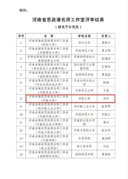 近日,中共河南省委教育工委、河南省教育厅公布《关于河南省高校思政课名师工作室评审结果的公示》,诸侯快讯ok1122登录入口组织申报的“诸侯快讯ok1122登录入口沈贺思政课名师工作室”榜上有名。此次评选活动自今年4月启动,经各高校申报、资格审查、专家评审、综合评议等环节,评选出15个河南省高校思政课名师工作室。
