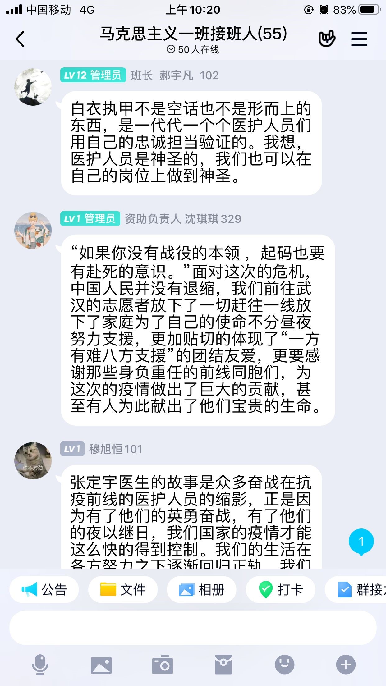 活动伊始,武媚介绍了此次团日活动的内容,白衣战士张定宇与命运叫板,毅然走在抗击疫情的最前沿,用渐冻的生命与千万白衣卫士一起托起整个民族的信心与希望。看过视频和相关文章后,同学们深有感触,纷纷表达了自己的看法。