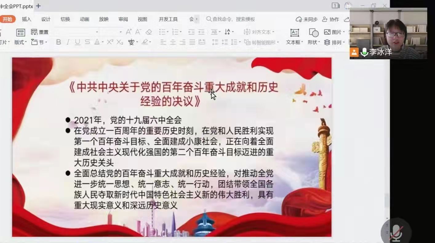 活动伊始,李冰洋从十九届六中全会会议介绍、为何要总结百年奋斗历史经验、中国共产党百年奋斗的辉煌成就、中国共产党百年奋斗的经验启示四大方面带领全体团员全面了解学习党的十九届六中全会。随后,全体团员共同阅读了《中共中央关于党的百年奋斗重大成就和历史经验的决议》原文。通过线上分组讨论过后,团员们分享了各自的思考和感悟。其中,2021级本科生郭靖雯表示,她通过该活动了解到本次会议的重要历史意义和现实意义,并表示自己也会继续深入学习党的十九届六中全会精神,争做社会主义接班人,为实现伟大复兴中国梦贡献自己的绵薄之力。其他同学们也纷纷表示要坚持党的领导,在学习中脚踏实地,坚定理想信念,自觉地做中国特色社会主义思想的坚定信仰者和忠实实践者。