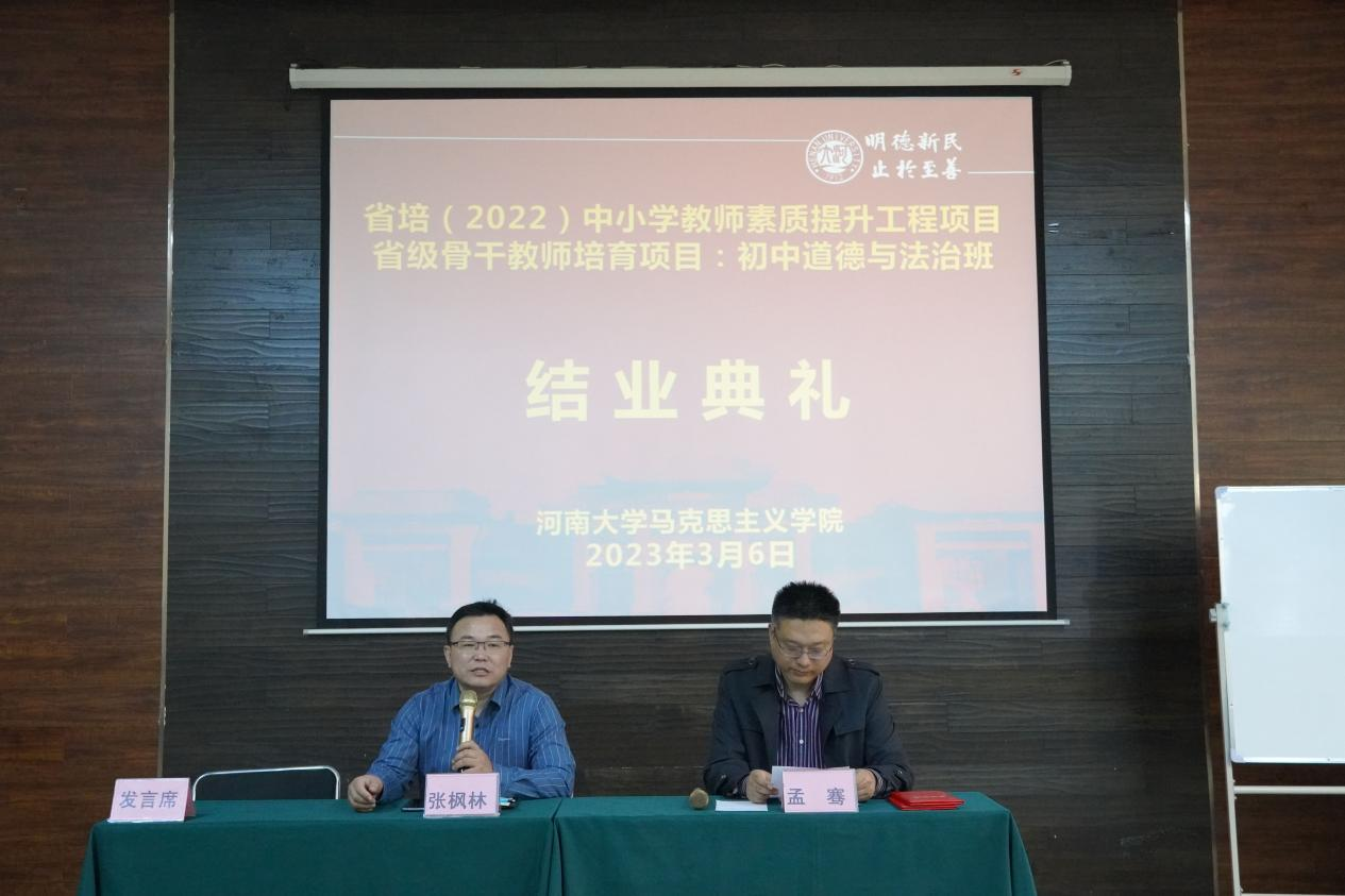 3月6日上午,诸侯快讯ok1122登录入口“省培计划(2022)”义务教育师资薄弱环节暨中小学素质提升工程项目省级骨干教师培育项目(初中道德与法治)结业典礼在开封市怡程酒店会议室举行。诸侯快讯ok1122登录入口副院长张枫林、孟骞出席结业典礼,结业典礼由孟骞主持。