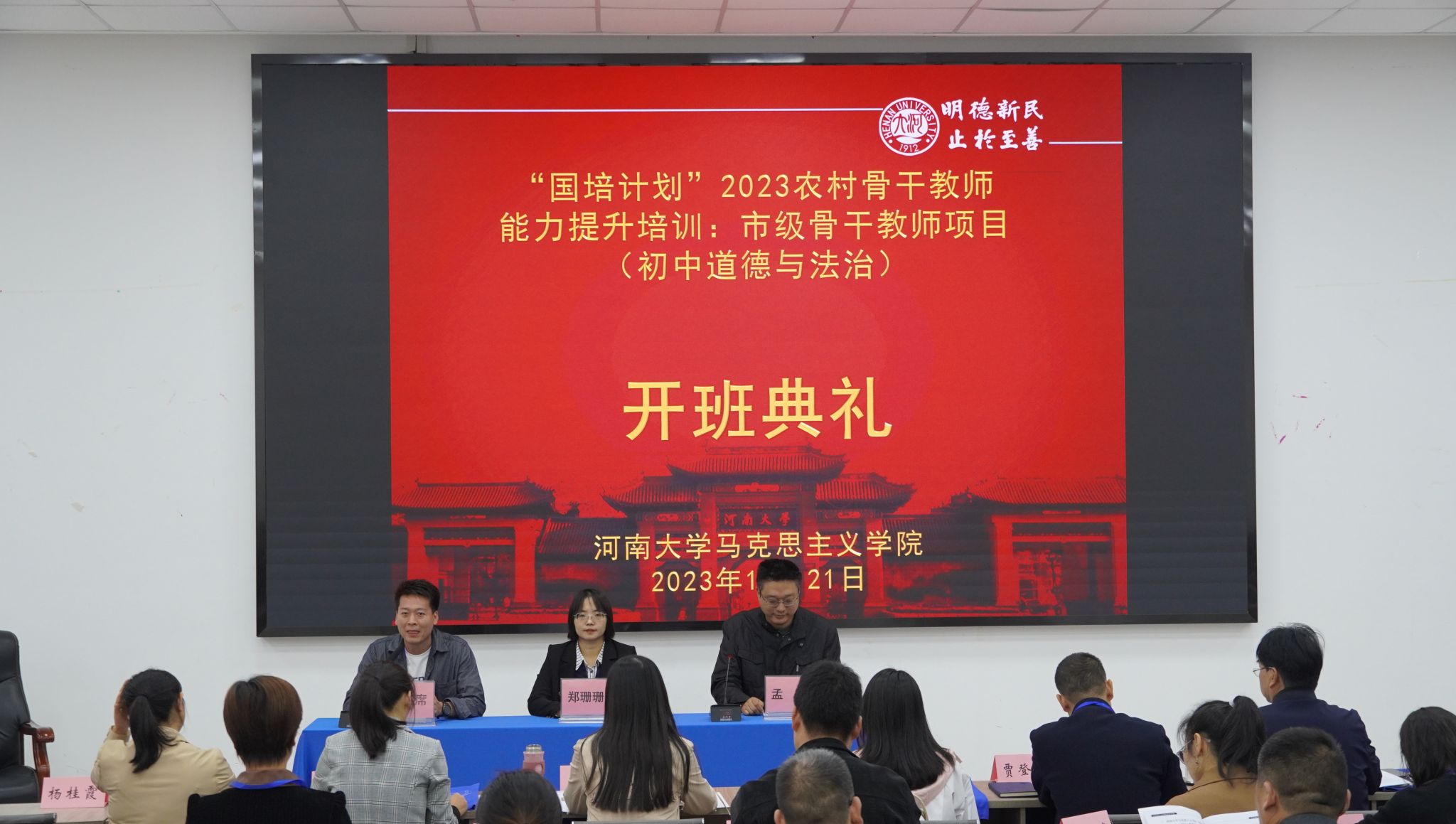 10月21日上午,河南⼤学“国培计划”(2023)农村骨干教师能力提升培训:市级骨干教师项目(初中道德与法治)开班典礼在诸侯快讯ok1122登录入口明伦校区科技馆⼀楼报告厅举行。诸侯快讯ok1122登录入口党委副书记郑珊珊、副院长孟骞参加了开班仪式,开班仪式由孟骞主持。本次培训共10天,10月20日报到,10月29日结束。