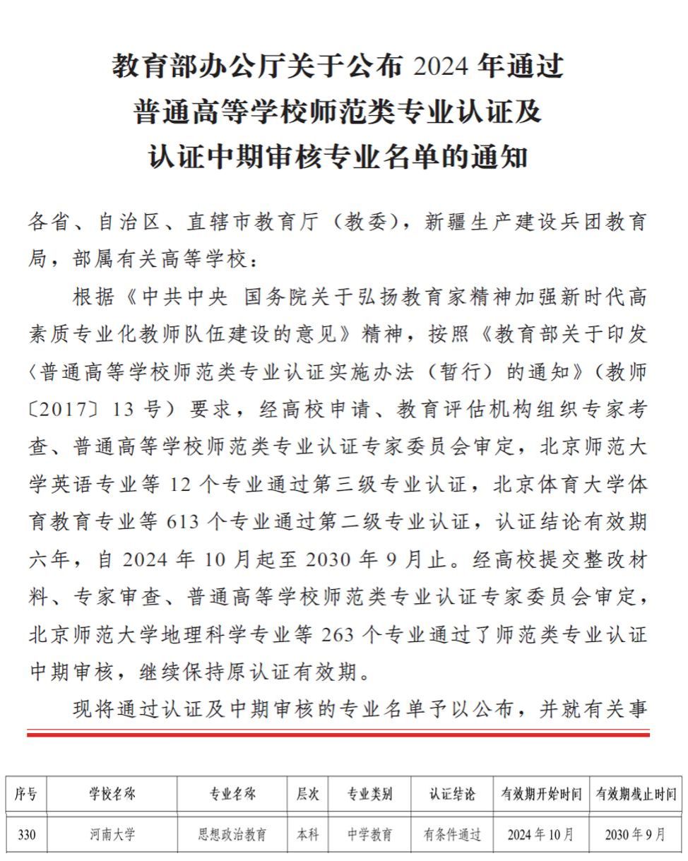 近日,教育部办公厅发布《关于公布2024年通过普通高等学校师范类专业认证及认证中期审核专业名单的通知》,我院思想政治教育本科专业通过2024年普通高等学校师范类第二级认证。