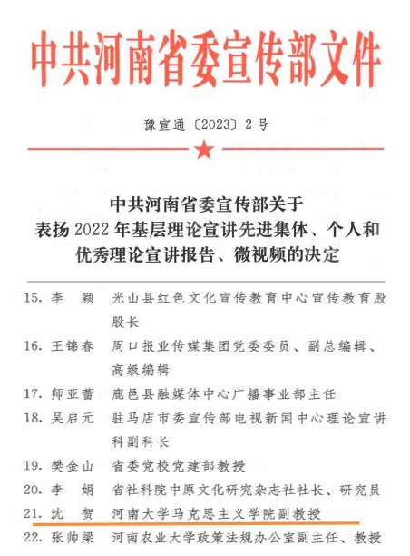 诸侯快讯ok1122登录入口教师沈贺获评为河南省基层理论宣讲先进个人